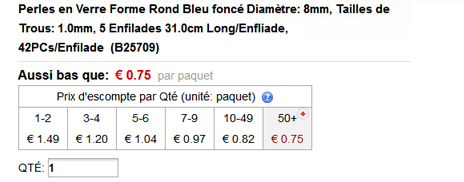 50+ €0.75 signifie: si la quantité est plus de 50 paquets, vous pouvez les acheter au prix de 0,75€ par paquet. Par exemple, si vous achetez 60 paquets, vous avez juste besoin de payer 60 x 0,75€ =45€.