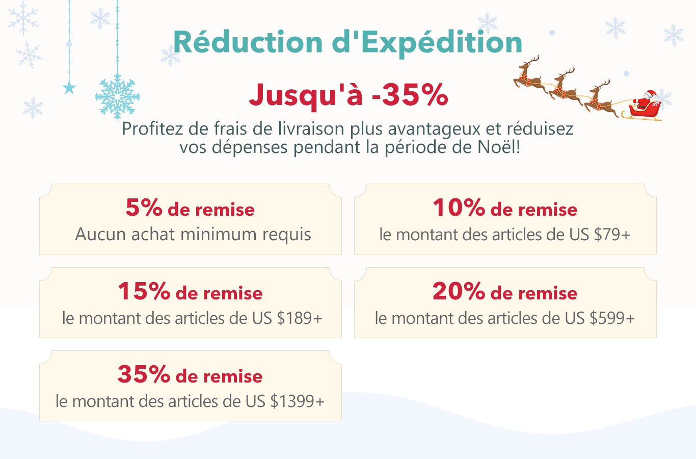 La réduction d'expédition s'applique à toutes les méthodes d'expédition (y compris l'expédition depuis la France) .